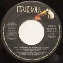 "Big Dreams in a Small Town" is a song recorded by American country music group Restless Heart. It was released in February 1989 as the third single and title track from the album Big Dreams in a Small Town. The song reached number 3 on the Billboard Hot Country Singles & Tracks chart.[1] It was written by Van Stephenson, Dave Robbins and Tim DuBois.