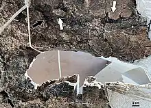 Big John bears a keyhole-shaped traumatic lesion (approx. 20 cm × 5 cm) on its right squamosal bone, which is possibly the result of a fight with another Triceratops.[8] The authors of a 2022 study concluded that the lesion was not simply an anatomical variation, based on the irregularity of its margins and the lack of similar structures in other Triceratops or Anchiceratops specimens.[8] A close examination of the lesion under an electron microscope noted that the bone at its margins was porous and disorganized, resembling newly formed bone.[8][9] This suggests that the injury had partially healed, and so was not the cause of death.[8][9] The study authors estimated that Big John died at least six months after receiving the injury.[8]