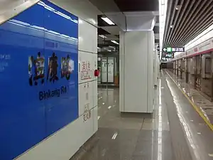 Binkang Road (Chinese: 滨康路) is a station on Line 1 and Line 5 of Hangzhou Metro in China.[1][2] It was opened in November 2012, together with the rest of the stations on Line 1. It is located in Binjiang District, Hangzhou.