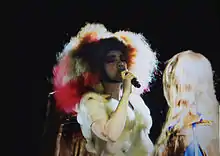 On 10 May 2011, Björk relaunched her official website.[38] Using a HTML5 constellation designed by M/M Paris, the website shifts around as the visitor moves the cursor.[39] In June 2011, she started posting photos of different minerals and crystals on her Facebook official page. One of those images, which was accompanied by the comment "...introducing" was used as a placeholder cover art for the pre-order of the album and mistaken for the official album cover.[28][40] Eventually, Björk unveiled the cover for the album on 17 August 2011.[41][42] The cover artwork, designed by longtime collaborators M/M Paris and shot by Inez van Lamsweerde and Vinoodh Matadin, features Björk, wearing an Iris van Herpen haute couture brown and golden dress, taken from the designer's Synesthesia 2010 collection, along with a "harp-belt" made by Threeasfour, and a red wig, resembling a nebula, created by British hairstylist Eugene Souleiman, holding an orange crystal while being surrounded by the Biophilia constellation which appears in the app.[43][44][45] According to Björk, she was inspired by the protagonist of British-Mexican surrealist novelist Leonora Carrington's book The Hearing Trumpet to create the persona of a "frustrated music teacher" which always has her "head in the clouds" to explain her concepts to people around her, an attitude she thought she had while explaining her idea for Biophilia to her collaborators, and that's why she decided to wear wigs throughout the whole Biophilia era and promotion.[46]