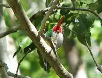 The avifauna of Puerto Rico included a total of 385 species as of July 2022, according to Bird Checklists of the World.[1] Of them, 201 are accidental, two have been extirpated, and one is believed to be extinct. Seventeen species are endemic. Non-native species are common; 43 listed here were introduced by humans. Individuals of many other species (mostly parrots, finches, and waxbills) are flying free, presumably after escaping or being released from captivity.[2] For example, a 2018 study on introduced Psittacidae on the island found at least 46 species present, of which 24% are only found in the pet trade (captivity), 48% have been observed in the wild (but are not known to be breeding), and 28% are established (naturalized) and know to have bred or are currently breeding.[3] Around 120 species breed in Puerto Rico while the majority of the others overwinter in the archipelago. An additional accidental species has been added from another source.