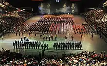 The Birmingham Tattoo is held annually at the Resorts World Arena, in Birmingham, England. The military tattoo features massed military bands, and displays. The event takes place for two performances in February each year. The event has been held since 1989 and has attracted performers from the United States, Europe and Russia as well as British bands from the Royal Marines, Coldstream Guards, King's Division and Gurkhas. The Birmingham Tattoo features traditional military music, field gun racing, dancers, dog display teams and one of the largest gatherings of standard bearers with around 100 standards on parade at each performance. Each year the event raises money at each performance for the Royal Star and Garter Homes who provide care homes for disabled ex-Service men and women. Over £126,000 has been donated to the charity since 2008.