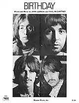 "Birthday" is a song by the English rock band the Beatles from their 1968 double album The Beatles (also known as "the White Album"). Written by John Lennon and Paul McCartney, mainly by McCartney, it is the opening track on the third side of the LP (or the second disc in CD versions of the record). Surviving Beatles Paul McCartney and Ringo Starr performed it for Starr's 70th birthday at Radio City Music Hall on 7 July 2010.[3]