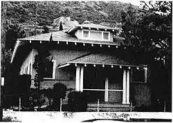 Slightly to the northwest of Garden Road is the Laundry Hill neighborhood. Laundry Hill Road originally intersected Garden, but no longer does so. Currently, access to the small cluster of houses in the neighborhood is by several long public stairs or via Moon Canyon Avenue and Adams A venue high above the canyon. On the opposite side of Tombstone from Garden, Brophy Avenue branches off to the left, runs past seven smaller-scale fran1e houses on either side, then rejoins Tombstone again, forming a miniature linearly-ananged neighborhood by itself. Continuing west on Tombstone Canyon, the Mule Gulch Channel is visible running along the north side of the road, along a stretch of flat land between Tombstone and Mayor Street (a smaller street running parallel to Tombstone). Crossing the channel is a concrete bridge built by the WPA, with both cast and mounted bronze logos of the agency on its sidewalk surface. A number of larger and somewhat later houses are located on Mayor Street, as well as some smaller houses further up the hill to the north. These are accessed by concrete stairways. Somewhat further up Tombstone Canyon is the City Fire Station, which has access to the street by a bridge over the channel. Continuing west on Tombstone Avenue, several residential roads branch off to follow small drainages rising from the main course of Tombstone Canyon. These include Star Avenue to the north, and Spring Canyon to the south, each with groupings of houses on both sides. Pace A venue, on the south, provides access to Garfield Elementary School, currently adaptively used as a bed-and-breakfast. The school's playground retaining wall was built by the WPA. The final side-canyon residential areas are along Locklin Avenue and Wood Canyon both diverging to the north side of Tombstone Avenue. At the southeast comer of Wood Canyon and Tombstone Avenue is the City Pump House, rebuilt by the WPA, and with a dated plaque on its east side.[5]