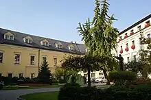 The Bishop's Palace in Kraków (Polish: Pałac Biskupi w Krakowie) is the seat of Kraków metropolitan Curia, Poland, and the traditional residence of Kraków bishops since the late 14th century. It is the second largest palace in the city after Wawel, former seat of the Polish monarchs. It is part of a monastery complex of the Franciscan religious order. Bishop's Palace is best known for being the residence of Pope John Paul II during his stays in the city. He used to give his blessings and talk to his followers from a window above the main entrance at night.[1]