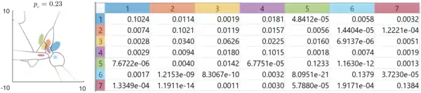 Left: Classification of seven multivariate normal classes. Coloured ellipses are 1 sd error ellipses. Black marks the boundaries between the classification regions. is the probability of total classification error. Right: the error matrix. is the probability of classifying a sample from normal as . These are computed by the numerical method of ray-tracing [16] (Matlab code).
