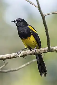 The juvenile black-cowled oriole resembles both the yellow-tailed oriole and the juvenile orchard oriole, but can be distinguished by its completely black tail and its lack of wing bars.[17] It is larger than an orchard oriole and much smaller than a yellow-tailed oriole.[14] Though the black-cowled oriole looks similar to the black-vented oriole, the two species are allopatric and live in different habitats; the black-vented oriole is found in dry highlands.[13][19] The black-vented oriole is larger, bulkier, and longer-tailed, with a black crissum, an orangey-yellow belly, and a longer, straighter beak.[13][16] Immature birds show less black on the face than do immature black-cowled orioles.[13] Female and immature black-cowled orioles can be confused with the yellow-backed oriole, but that species is brighter yellow on the head and back, with less black on the face, and a stouter, straighter bill.[13] Females and immatures also resemble the female bar-winged oriole, but that species is probably allopatric (found only on the Pacific slope), and typically has less dark wings and tail, and a pale wing bar.[13] Audubon's oriole, which is seldom found in the same habitat or range, is larger, with a heavier, straight beak and tertials which are edged in white in fresh plumage.[13]