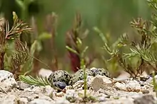 This stilt chooses mudflats, desiccated lacustrine verges, and levees for nest locations, as long as the soil is friable. Reproduction occurs from late April through August in North America, with peak activity in June,[14] while tropical populations usually breed after the rainy season. The nests are typically sited within 1 km (0.62 mi) of a feeding location, and the pairs defend an extensive perimeter around groups of nests, patrolling in cooperation with their neighbors.[15] Spacing between nests is approximately 65 ft (20 m), but sometimes nests are within 7 ft (2.1 m) of each other and some nests in the rookery are as far as 130 ft (40 m) from the nearest neighbor. The black-necked stilt is actually classified as semicolonial since the nests are rarely found alone and colonies usually number dozens, rarely hundreds of pairs.[16] The nests are frequently established rather close to the water edge, so that their integrity is affected by rising water levels of ponds or tides. This is particularly a hazard in the case of managed salt ponds where water levels may be altered rapidly in the salt pond flooding process.[5][17]