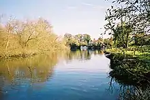 Another curious nearby name is an old house called "Poisson Duc",[5] locally corrupted to Poison Duck. The name is in Norman French, indicating the site was the fish keeper's cottage, for the Norman Lord of the Manor.[6] Domesday Book recorded that Hurley had been held before the conquest by Esgar, on behalf of King Edward), and by 1086 it was held by was part of the lands of Geoffrey de Mandeville, whose family went on to become Earls of Essex.[7] Domesday records two fisheries at Hurley, worth 12 shillings annually.[8] These would have used fish ducts or traps in the river here to catch fish travelling up or down the Thames.[2]