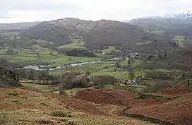 Black Fell's northern boundary is formed by Elter Water and the River Brathay. The broadleaved woodland of Brow Coppice stands above the village of Skelwith Bridge in the valley. Beyond the eastern slopes is a mile of gently falling country, running through plantations to the head of Windermere. There are many tarns within this landscape, most of them artificial. The largest are Blelham Tarn and the pools near the Drunken Duck (Inn) crossroads. On the western side is the A593 road from Coniston to Ambleside, crossing the minor pass of Oxen Fell.