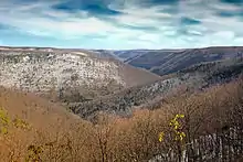 The Black Forest Trail is a 43.0-mile (69.2 km)[nb 1] hiking trail in north-central Pennsylvania, forming a loop through portions of Tiadaghton State Forest and routed through Pine Creek Gorge and areas of the Allegheny Plateau above the gorge. Most of the trail is in Lycoming County, with about five miles in Potter County and a very brief segment in Clinton County.[1] The trail was named after the region's original forest landscape, which reminded immigrant loggers of the Schwarzwald ("black forest") region of Germany.[2]