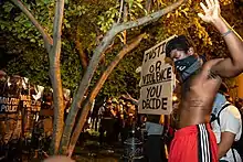 Black Lives Matter originally used various social media platforms—including hashtag activism—to reach thousands of people rapidly.[58] Since then, Black Lives Matter has embraced a diversity of tactics.[59] Black Lives Matter protests have been overwhelmingly peaceful; when violence does occur, it is often committed by counter-protesters.[60][61][62] Despite this, opponents often try to portray the movement as violent.[62][63]