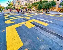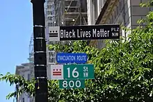 Black Lives Matter Plaza (officially Black Lives Matter Plaza Northwest) is a two-block-long pedestrian section of 16th Street NW in downtown Washington, D.C.[1][2] The plaza was renamed by Mayor Muriel Bowser on June 5, 2020, after the Department of Public Works painted the words "Black Lives Matter" in yellow, 35-foot-tall (11 m) capital letters, along with the D.C. flag, during the series of George Floyd protests taking place in the city.[3][4][5]