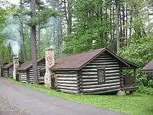 Cabins 1 - 6 are single room log cabins with saddle corners and white cement chinking. They have gable entries and an exterior stone fireplace on the end opposite the entry. Cabins 7 - 12 are two-room log cabins with eave entries and stone fireplaces along the rear walls. The Lodge (also known as Cabin 13) is a large rectangular clapboard-sided building with a large centrally-located stone fireplace. Cabin 14 is an L-shaped cabin with an open porch; the stone fireplace forms one exterior wall, while the other walls are clapboard.[3] Two pit latrines built by the CCC are protected: both have shed roofs and are clapboard sided.[3]