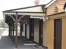 The brick main station building is of a type 4 standard roadside design with a brick platform, and was completed in 1884. The landscaping around the platform and entrance and the station fences and signs are also heritage-listed.[1]