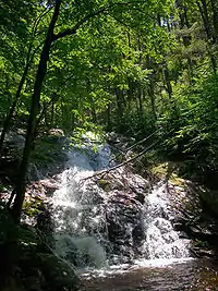 Most public access comes from Route 9W, near the lowest portions of the land, and many of the research and educational facilities are located in that north central area. To the south, in the Highlands portion of the forest, the land rises over a thousand feet (300 m) to several peaks, including the eponymous 1,402 foot (427 m) Black Rock with its observation tower and Spy Rock, at 1,463 feet (446 m)[7] the highest point in the Town of Highlands and the highest peak in the Highlands west of the Hudson River.[1][8] There are seven ponds in the forest,[7] all of which form part of the village of Cornwall on Hudson's water supply system save Sutherland Pond, the only one in which visitors are allowed to swim.[9] The ponds drain into an unnamed stream that crosses the village and empties into Moodna Creek near where it joins the Hudson; Sutherland gives rise to Mineral Springs Brook, which flows out to the scenic Mineral Springs Falls near the western end of the forest and then to Moodna Creek's main tributary, Woodbury Creek.