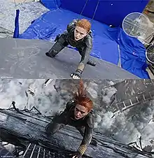 The film's visual effects vendors included Cinesite, Digital Domain, Industrial Light & Magic, Mammal Studios, SSVFX, Scanline VFX, Trixter, and Wētā FX.[153] Digital Domain was responsible for the final battle sequence and completed around 320 visual effects shots for the film. They created the Red Room, an airborne fortress hidden in the clouds, which was inspired by the brutalist architecture of the Soviet Union.[154][155] A combination of practical and visual effects were used to create the sequence where the Red Room is destroyed and falls from the sky: actors and stunt performers were filmed in a wind tunnel against bluescreens while being held with wires and mechanical arms, and the surrounding environment of sky and debris was created digitally.[154][155] Cinesite primarily handled the Russian prison that Harbour's Alexei Shostakov is found in during the film.[156] Wētā FX created the mountain range that surrounds the prison, based on photography from Svalbard, Norway, as well as an avalanche. Wētā also created the Mil Mi-8 helicopter that is seen in that sequence,[157] while Cinesite created it for other sequences.[156] For the pigs on the farm of Weisz's Melina Vostokoff, Wētā filmed live Kunekune pigs as reference for the digital pigs in the final shots.[157]