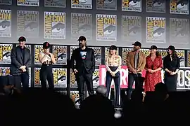 From left: Feige, Johansson, Harbour, Pugh, Fagbenle, Shortland, and Weisz at the 2019 San Diego Comic-Con