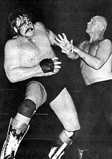 Mulligan (left) blooded during a match against Baron von Raschke (right), circa 1978.
