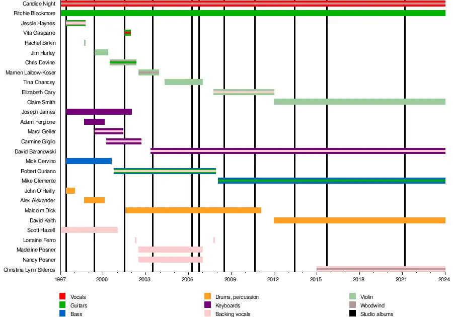Candice Night was a Rainbow fan, and first encountered Ritchie Blackmore to ask him for an autograph in 1989, while she was working for a local New York radio station. The two started living together in 1991, and discovered they both had a passionate interest in Renaissance music.[1]