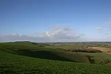 To the east and north the view is interrupted by low limestone hills, and, occasionally, hills like Duncliffe rise dramatically from the plain. The Frome valley in the north is thinly populated, settlements and parks on the valley sides looking down on arable farmland. In the east along the Vale of Wardour, settlement increases and arable farming is also more prevalent here.[2]
