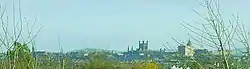 Blacon is next to the Welsh border, on a hill one mile north-west of and overlooking Chester. The village is built on what was previously farmland and is surrounded by open countryside. Blacon has views across to the city centre of Chester and to the Welsh hills twenty miles to the west. Other nearby places include Upton-by-Chester to the north, Saughall and Mollington to the north-west, Newtown to the north-east and the border town of Saltney to the south. Blacon also has a close proximity to the Wirral, being 6.5 miles from the village of Overpool.[3]