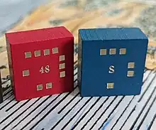 In 1972, Lance Gutteridge of Gamma Two Games originally planned on using six-sided dice to represent pieces and to provide for step reduction in combat strength. The high cost of dice led him to decide to instead use embossed wooden blocks showing 2, 3 or 4 steps in combat strength.[1] The first such block wargame was Quebec 1759, depicting the campaign surrounding the Battle of the Plains of Abraham.[2] Gamma Two Games later produced the block wargames War of 1812, simulating the war of that name, and Napoleon, simulating the campaign leading up to the Battle of Waterloo. In 1982, Gamma Two changed its name to Columbia Games.[2]