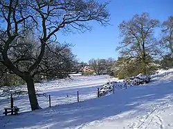 In later life Sir William devoted himself to forming genealogical and heraldic collections, known as "The Blois MSS" which were continued by his son Sir William, the eldest of four but only surviving son, after the father's death in 1673.[8] This young William married first Martha (daughter of Sir Robert Brooke of Cockfield Hall), who died in 1657 leaving him with an only son, Charles Blois (1657-1738). He married secondly Jane, daughter of Sir Nathaniel Barnardiston, of Ketton, Suffolk, the widow of Martha's brother John. William survived his father by only three years, and died in London in 1676: his widow Jane accepted administration at probate.[9] The heraldic interest continued, for the remaining part of Grundisburgh Hall retained (at the time of listing, in 1966) a late 17th century mural painting of 70 coats of arms of East Anglian families.[10]