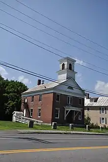 The Bloomfield Academy is a two-story brick structure with a gable roof, granite trim, and a granite foundation. It is topped by a two-stage tower, whose first stage is a plain clapboarded square with a simple cornice, and whose second stage has arched louvered openings flanked by pilasters, with an entablature and cornice above. The main (east-facing) facade is three bays wide, with brick piers dividing them. There is a double-door entry in the center, sheltered by an extended hip-roofed hood. The flanking bays have sash windows at both levels, while the second level above the entry as a double sash window. The gable end above is clad in clapboards, and has a semi-oval window in its center.[2]