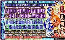 In the opening match, Pegasso was the first of many wrestlers to wear a Blue Panther inspired mask and ring gear specifically for the occasion.[14] Pegasso and Stigma defeated Cancerbero and El Coyote, two falls to one in 9 minutes and 57 seconds.[15][16]