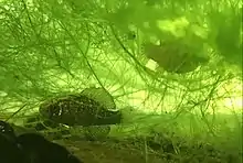 | Male (left) and female (right, obscured) Elassoma okatie in aquarium. | |
