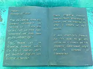 The Boer War Memorial in Canberra, Australian Capital Territory, is on Anzac Parade on the western row of memorials near Lake Burley Griffin. This commemorates the Military history of Australia during the Second Boer War, 1899-1902.[1]