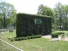 In 2009, the cemetery added a columbarium specially dedicated to Chicago Cubs fans.[14] The structure is a replica of Wrigley Field's red brick wall, with a stained glass image of the stadium's scoreboard and a yellow 400 foot (120 m) marker. The wall contains 288 niches, and seats from Wrigley Field have been placed along its base. A Cubs fan named Dennis Mascari helped raise funds for the project in hopes of making visits to the cemetery less depressing. The cemetery agreed to let him build the columbarium on their grounds, but nixed a plan to broadcast Cubs games through a nearby speaker. The Cubs themselves were not directly involved with the project; Mascari worked with Eternal Images, which makes baseball-themed funerary products.[14]