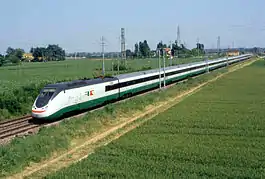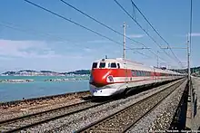 For much of the section between the stations of Pesaro and Ancona, the railway runs next to the shoreline. Using the coastal strip, belonging to the state, was cheaper than expropriating properties, as had been done between Bologna and Rimini.[15] Here, an ETR 450 is photographed between Palombina and Ancona Torrette in June 2005.