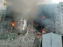 As Russian forces fought in and near Kyiv, Borodianka, which is on a strategically important road,[4] was targeted by numerous Russian airstrikes.[6] The deadliest bombing was conducted in the evening of 1 March and the morning of 2 March, when Russian aviation destroyed 8 multi-storey residential buildings, killing at least 40 civilians.[7]