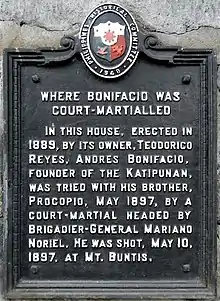 In this house, erected in 1889, by its owner, Teodorico Reyes, Andres Bonifacio, founder of the Katipunan, was tried with his brother, Procopio, May 1897, by a court-martial headed by Brigadier-General Mariano Noriel. He was shot, May 10, 1897, at Mt. Buntis.[3]