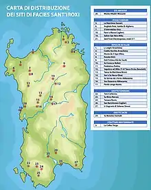 Bonnanaro sites, mostly burials, are scattered throughout Sardinian territory, with a higher concentration in the mining regions of Nurra and Sulcis-Iglesiente and in the Campidano.[4] Ceramics were smooth and linear without decorations and characterized by handles. Numbers of metal objects increased and the first swords of arsenical bronze appeared.