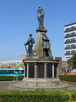 The memorial was built in stone from the Forest of Dean, and the figures are in bronze, cast by the Maneti foundry. The overall height of the memorial is about 7.3 metres (24 ft), and the figures standing on the base are about 2.1 metres (7 ft) high.[2] The base of the monument stands on two circular steps, and has twelve sides divided by pilasters. Between the pilasters are bronze plaques inscribed with the names of the Bootle men who were killed in the World Wars. Standing on the base is a triangular obelisk with concave sides, which carries the figure of a mother holding her child. On the base around the obelisk are three standing figures, a soldier, a sailor, and an airman.[lower-alpha 1] Between the figures are three bronze wreathes. On the west side of the memorial is a plaque commemorating the Liverpool Escort Force of the Second World War.[3][4] An inscription on the monument reads "In grateful memory of over a thousand men from Bootle who made the supreme sacrifice in the Great War, 1914-1918".[4]