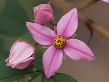 Boronia umbellata, commonly known as the Orara boronia,[2] is a plant in the citrus family Rutaceae and is endemic to a small area on the north coast of New South Wales. It is an erect shrub with many branches, aromatic, pinnate leaves and clusters of up to ten dark pink flowers in the leaf axils.