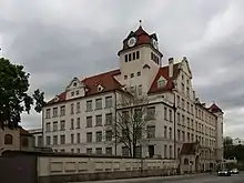 The eastern end of Boschetsrieder Straße between the slope edge and the Maximiliansbahn was to be built with residential buildings for the workers of the industrial area. In anticipation, architect Robert Rehlen built a primary school in 1903/04 in a compact Art Nouveau style on a largely open field.[5] In accordance with the pedagogical and social concept of the Georg Kerschensteiner municipal school council, the school was equipped with classrooms, rooms for technical training and facilities for the entire neighbourhood. Therefore, children's bath, a children's home and a social centre were integrated into the school building. Together with the school, Rehlen also built the neighbouring fire station.