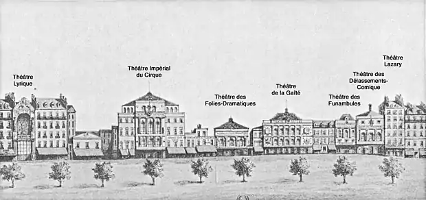 The history of the names of the theatres at various sites on the boulevard du Temple is summarized in the following list. Unless otherwise noted the names and dates are from Lecomte,[5] and the street addresses are based on the 1861 Paris guide of Lehaguez.[6]