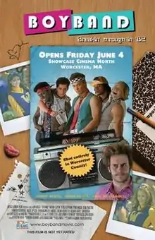 BoyBand is a comedic feature film released in 2010 that depicts the fictional saga of the first ever American boy band. The film stars Michael Copon, Robert Hoffman, Ryan Hansen, Ryan Pinkston, Ernest Phillips, Lorenzo Hooker III, Kurt Fuller, Ming-Na, Richard Riehle, and Tom Wright. The film was shot entirely in the county of Worcester, Massachusetts and even features a fictional Worcester High School. BoyBand was produced by Worcester-based Artigo/Ajemian films. The film was written and directed by Jon Artigo, and produced by Andrea Ajemian.[2] Kaz Gamble produced and recorded the entire soundtrack. The film is also known as BoyBand: Breakin' through in '82. Film Threat reviewed BoyBand, writing that "The problem entirely lies in a story, so wacky you can't relate to it and jokes that have no payoff. Boy Band is a wasted opportunity."[3]