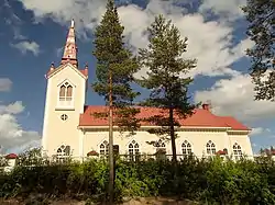 Bräcke Church (Bräcke kyrka) was built in the summer of 1859 following a drawing by Abraham Rafael Ulric Pettersson (1824-1866). The church building is externally clad with white painted wooden paneling. The ceiling of the church room has a thin vault of wood. The altarpiece was painted in 1926 by Stockholm artist Karl Tirén (1869-1955). In the church tower hang two bells; the little bell was cast in 1778 and large bell was cast in 1859.[3] [4]