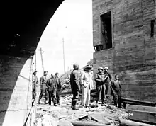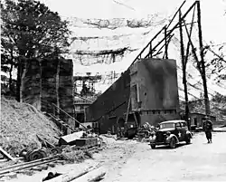 Codenamed Ölkeller Cherbourg ("Cherbourg oil cellar"),[9] Brécourt's installations were reused by the German army to store V-2 rockets.[10][11] Brecourt was variously codenamed was "Minenlager" (mine storage) or "Ersatz B8" or "Wasserwerk n°2".[6] The site was intended to accommodate 30 V-2 rockets, 6 tanks capable of storing 330 tons of liquid oxygen, and equipment for mobile firing units that would utilize firing platforms to be established nearby.[5] When the V-2 program was delayed by technical difficulties and the location was not found appropriate, the German Army abandoned its project to deploy the V-2 missile in Brécourt and became available at the end of 1943.[5]