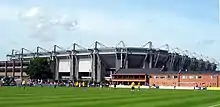The connected upper stands meant that the corners of the stadium became partly enclosed, and toilet stalls as well as food and drink outlets were placed in the spaces between the lower and upper stands.[42] The new upper stands included 13,600 new seats, increasing the total capacity to 31,500 spectators.[38] For international matches, capacity was limited to 26,500 spectators as they demand all-seated crowds.[38] The entire redevelopment progressed while the club still played its home games at the stadium, and the original changing rooms under the main grandstand, originating from 1978, were retained.[42]