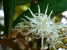 It grows up to about 6 metres and is usually found along river banks or other moist areas. The leaves of this dioecious tree are lanceolate, and it bears cream-coloured flowers.[1][2]