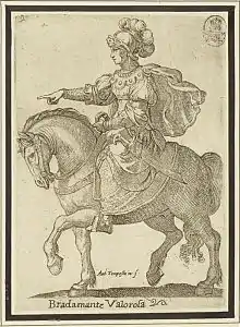 Bradamante (occasionally spelled Bradamant) is a fictional knight heroine in two epic poems of the Renaissance: Orlando Innamorato by Matteo Maria Boiardo and Orlando Furioso by Ludovico Ariosto.[1] Since the poems exerted a wide influence on later culture, she became a recurring character in Western art.[2][3]