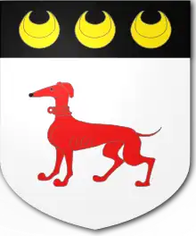 ArmsArgent, a Greyhound passant Gules, on a Chief Sable three Crescents Or. Crest: An Arm in Armour embowed the hand grasping a Scimitar, all proper. Motto: VIRTUTE ET NON VI (By virtue not by force)
