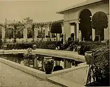 The 3+1⁄2-story mansion built in 1897, enclosing an 1890 house that had been built on the site by Mary Pratt Sprague (later Mrs. Edward Brandegee). The mansion has elaborate interior decorations, including a dining room paneled in mahogany, a second dining room in oak, and a ballroom with elaborate candelabras and chandeliers, with tapestries by Gobelins. The house stands on a slight rise, looking over a landscaped formal garden, which included a pool and an open summer house.[2]