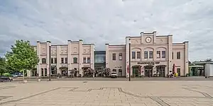 Brandenburg Hauptbahnhof is the main railway station in the town of Brandenburg an der Havel in the German state of Brandenburg. It lies on the Berlin–Magdeburg railway at the junction with the Brandenburg Towns Railway. It has largely lost its former major role for long-distance passenger services and freight traffic, but it continues to serve regional traffic. A water tower on the site of the former freight yard and a plaque commemorating French forced labourers at the station buildings are heritage-listed. The station was renamed Brandenburg Hauptbahnhof at the end of World War II, previously it had been called Brandenburg Rb (Rb for Deutsche Reichsbahn) station.[4] It is classified by Deutsche Bahn as a category 3 station.[1]